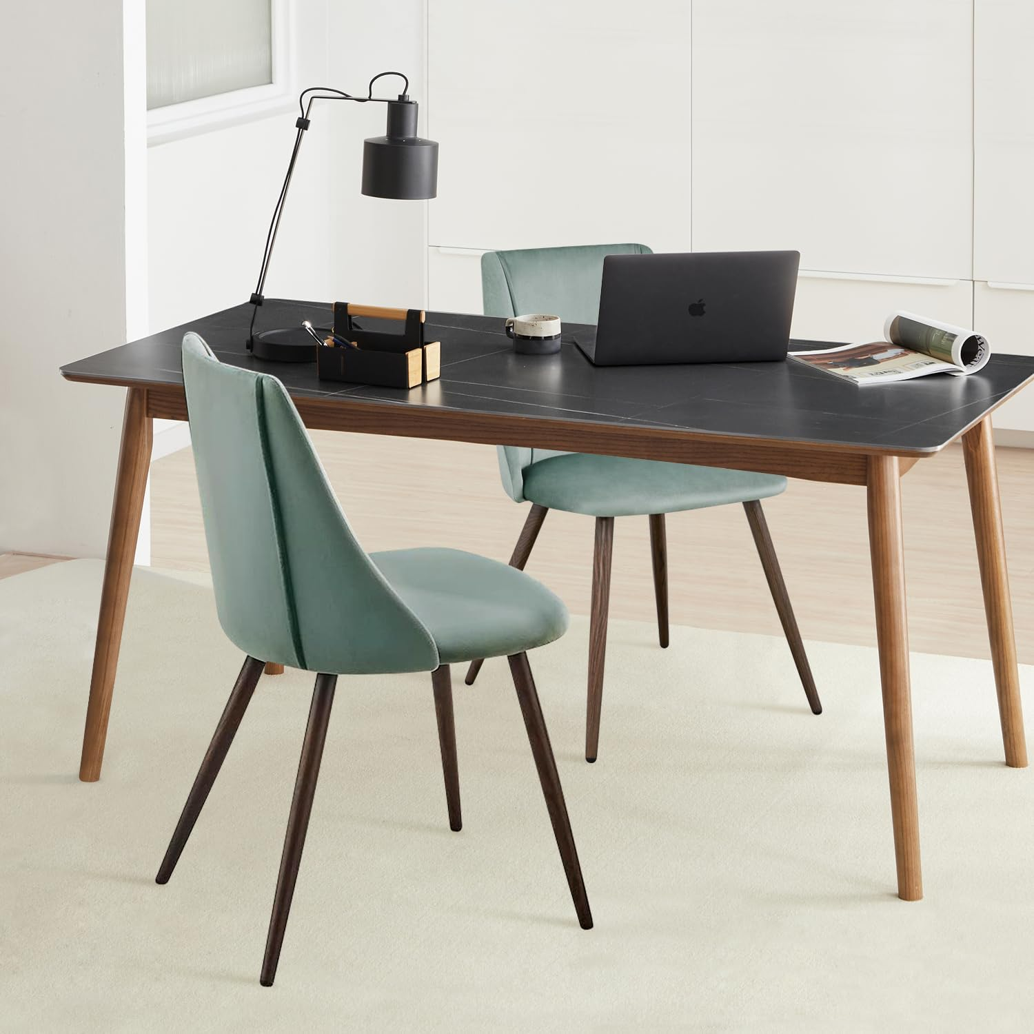 Werten Sie Ihre Sitzgelegenheiten mit diesem 2er-Set Esszimmerstühle im Mid-Century-Modern-Stil auf, das Eleganz, Komfort und Langlebigkeit vereint. Jeder Stuhl ist mit luxuriösem Samt bezogen, der sich weich und hautfreundlich anfühlt und jedem Raum eine edle Optik verleiht. Die große, gepolsterte Sitzfläche und die stützende Rückenlehne bieten Komfort beim Essen, Arbeiten oder Entspannen, während die robusten Metallbeine für Stabilität und Langlebigkeit sorgen. Das Set besteht aus zwei gepolsterten Stühlen, die als Esszimmerstühle, Akzentstühle, Schminktischstühle oder zusätzliche Sitzgelegenheiten genutzt werden können und somit eine vielseitige Wahl für jede Einrichtung darstellen.