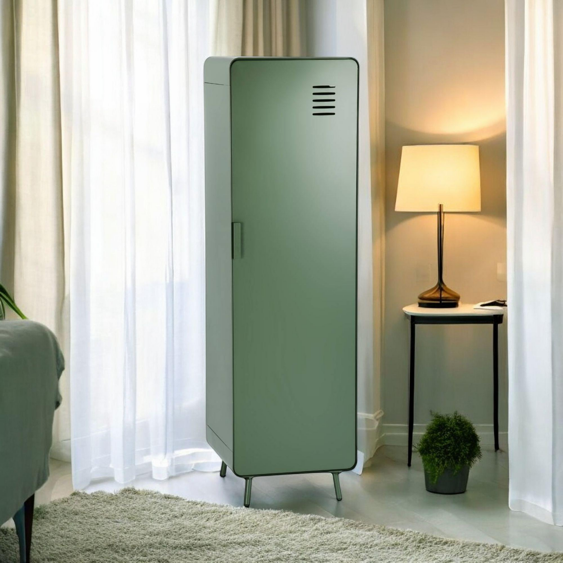 - Belüftete Tür für optimale Luftzirkulation: Die einzelne Metalltür verfügt über sauber geschnittene Belüftungsschlitze für eine verbesserte Luftzirkulation, wodurch Gerüche und Feuchtigkeitsansammlungen reduziert werden.