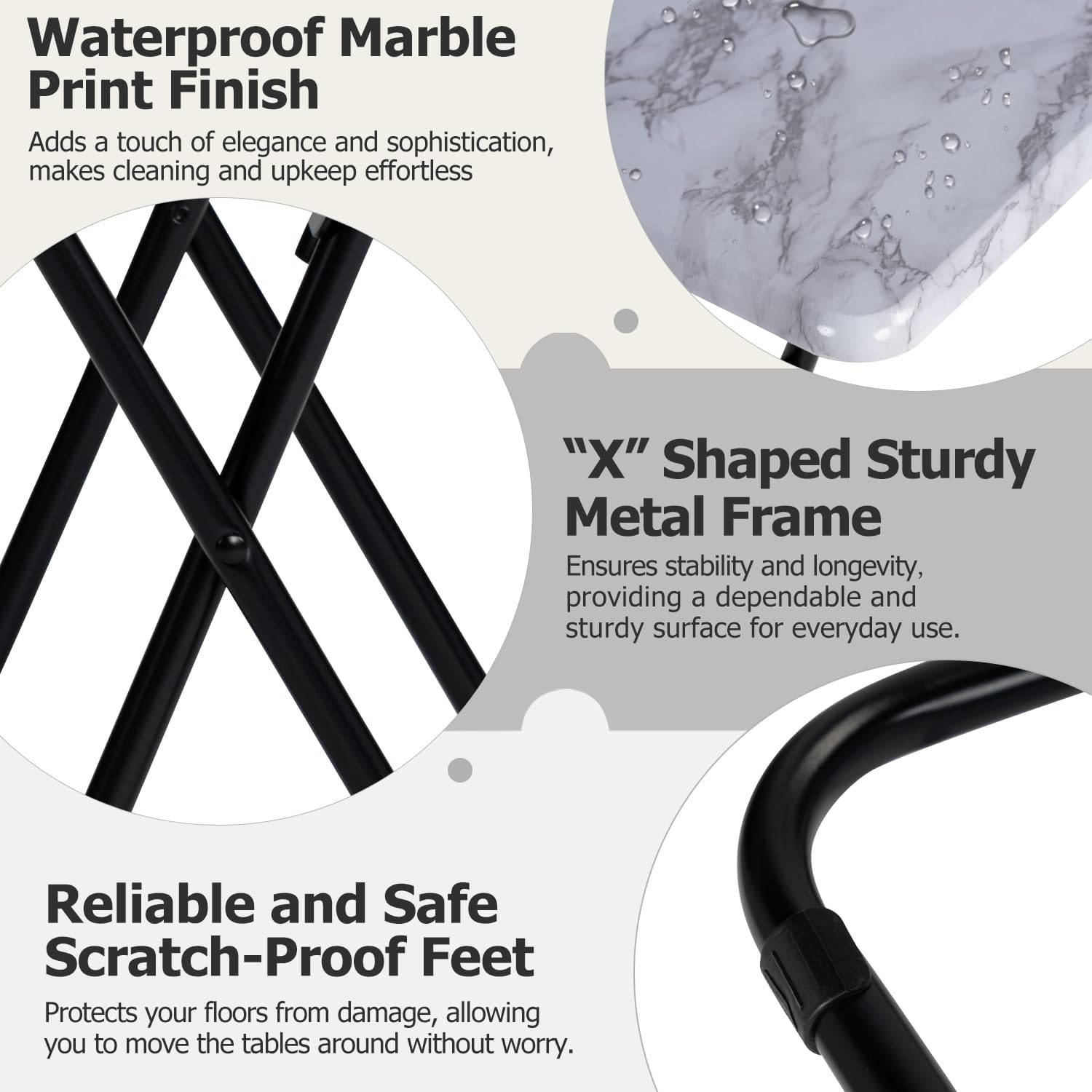 - Conception pliable : Faciles à plier pour un rangement pratique et un gain de place lorsqu’elles ne sont pas utilisées. Idéales pour les petits espaces, ces tables se plient et se rangent facilement pour optimiser l’espace.