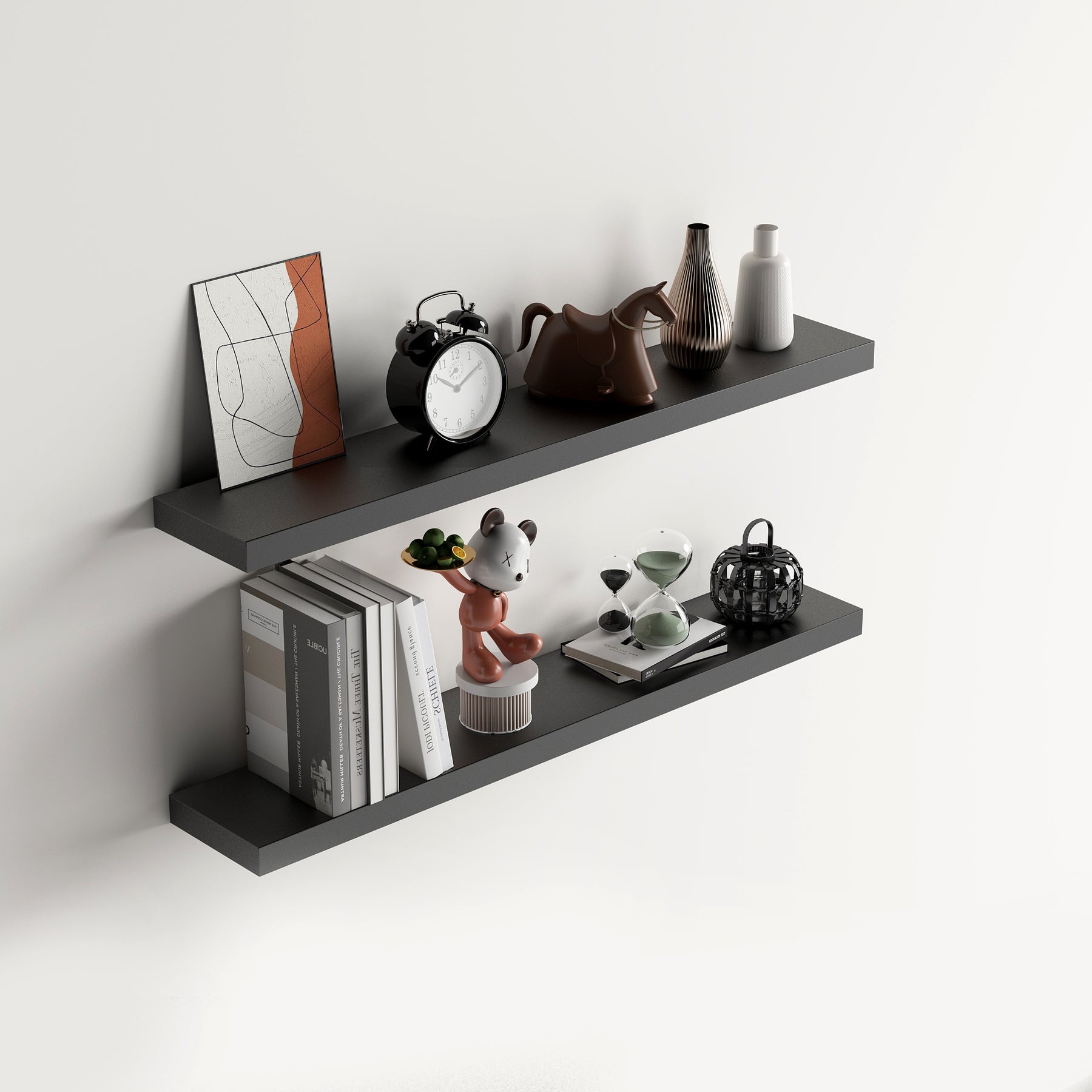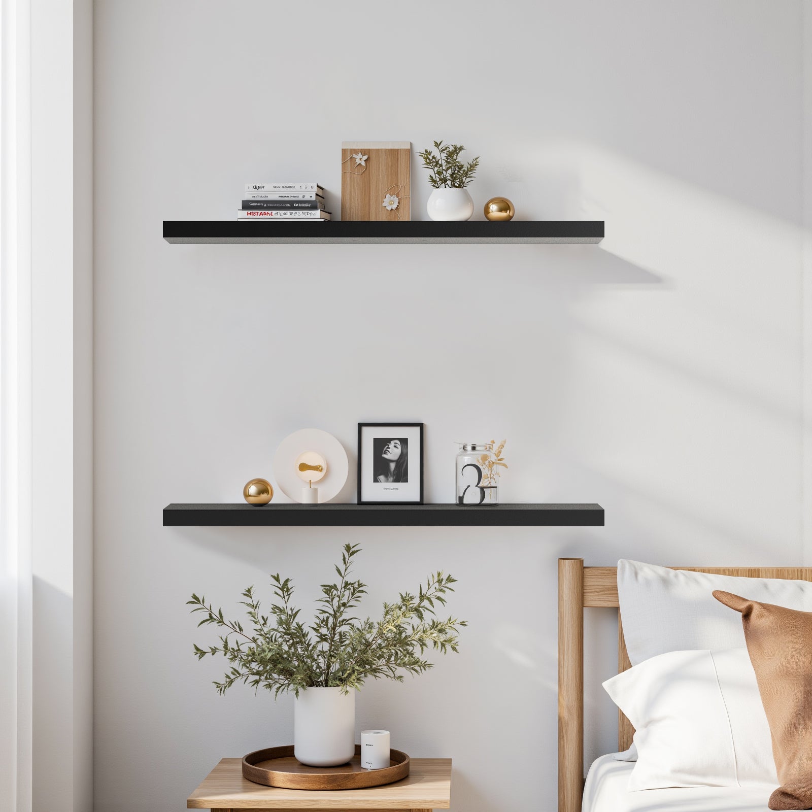 Ces étagères murales flottantes optimisent l'espace et allient esthétique et design grâce à un système de fixation invisible qui leur confère un style épuré et moderne. Idéales pour exposer livres, œuvres d'art ou objets décoratifs, elles créent une impression d'ordre et d'harmonie visuelle, tout en évitant l'encombrement.